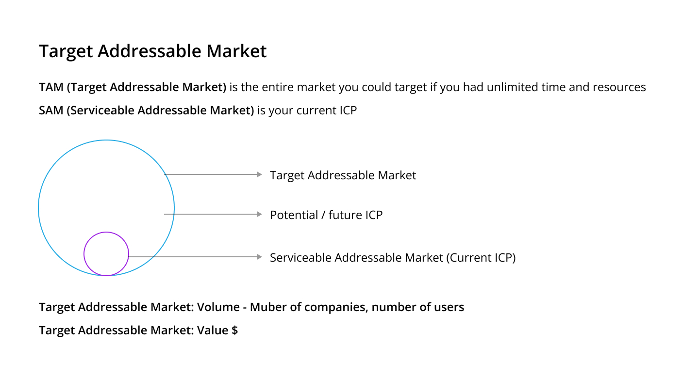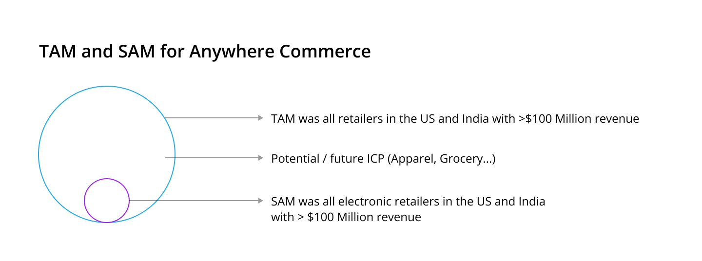Let's stick with our Anywhere Commerce example. Maybe right now, you're focused on electronic retailers in the US and India. That's your current Serviceable Addressable Market (SAM). But your future Ideal Customer Profile (ICP) might evolve to include other categories or mid-market companies. Your TAM helps you see the big picture and plan for that growth.